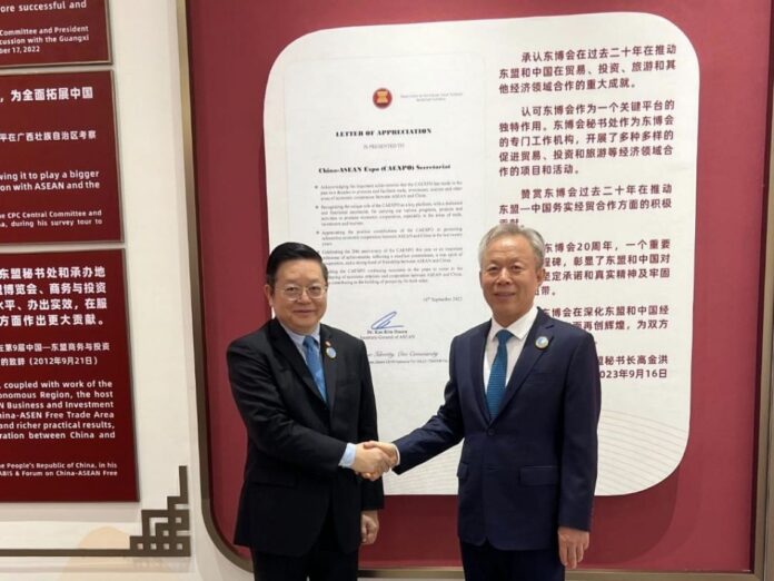 Secretary-General of ASEAN, Dr. Kao Kim Hourn, today toured the China-ASEAN Expo (CAEXPO) Pavilion, to observe the preparations for the opening of the 21st CAEXPO, on 24 September 2024. The tour covered the B2 area of the Nanning International Convention and Exhibition Center, where the ASEAN Member States, Observer, and the ASEAN Secretariat are located.