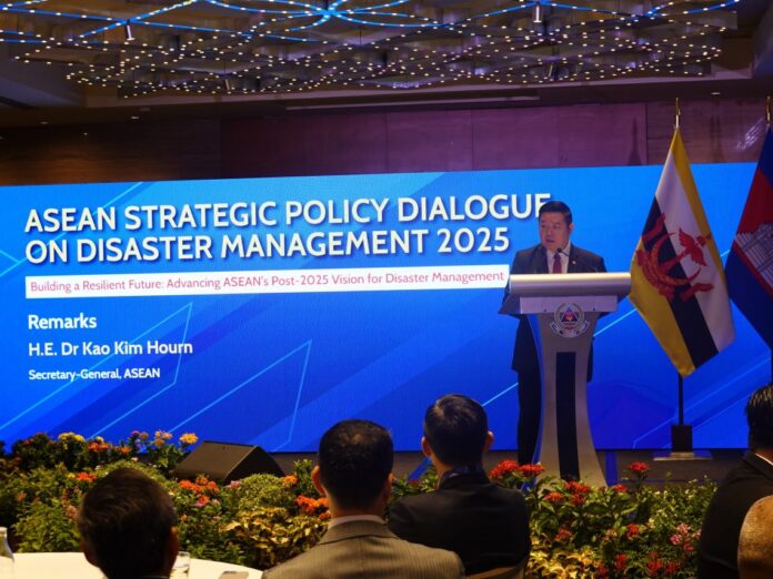 Secretary-General of ASEAN, Dr. Kao Kim Hourn, today participated in the ASEAN Strategic Policy Dialogue on Disaster Management (SPDDM) 2025, held at the Grand Hyatt Hotel, in Singapore. Dr. Kao delivered remarks at the Opening Session, along with Minister for Law and Second Minister for Home Affairs of Singapore Edwin Tong, Deputy Secretary-General of the National Committee for Disaster Management of Cambodia and Representative of the Chair of ASEAN Committee on Disaster Management (ACDM) Ma Norith, as well as with Ambassador of the European Union to ASEAN Sujiro Seam. Dr. Kao also delivered a keynote address at the SPDDM 2025 on the “Post-2025 Vision for ASEAN’s Resilience: A Perspective,” where he underscored the importance of harnessing innovation and advanced technologies across the disaster management cycle, and also highlighted that partnership and inclusivity must underpin all disaster management efforts.