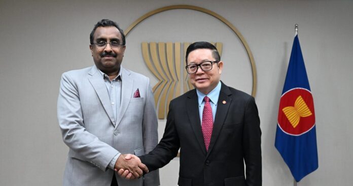 Secretary-General of ASEAN, Dr. Kao Kim Hourn, today received a Courtesy Call from President of the India Foundation, Ram Madhav, at the ASEAN Headquarters/ASEAN Secretariat. Both sides discussed the ongoing and future cooperation under the ASEAN-India Comprehensive Strategic Partnership (CSP), and deliberated on ways to further strengthen cooperation with the India Foundation to the next level, including in the areas of youth engagement and people-to-people exchanges.