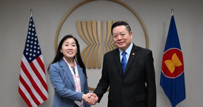 Secretary-General of ASEAN, Dr. Kao Kim Hourn, today met the Chargé d’Affaires ad interim of the United States Mission to ASEAN, Joy Sakurai, at the ASEAN Headquarters/ASEAN Secretariat. They exchanged views on regional and international issues of common interest and concern, and discussed ways to further strengthen the ASEAN-United States Comprehensive Strategic Partnership, particularly in light of the 50th anniversary of ASEAN-US relations in 2027.
