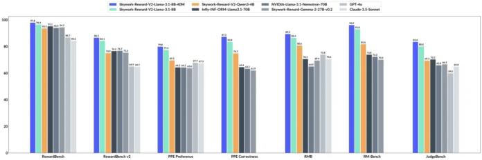 On seven mainstream reward model evaluation benchmarks including Reward Bench v1/v2, PPE Preference & Correctness, RMB, RM-Bench, and JudgeBench, the Skywork-Reward-V2 series comprehensively achieved current state-of-the-art (SOTA) levels.