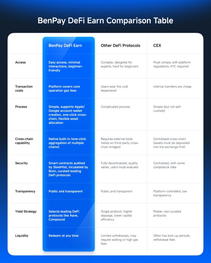 DENVER, Oct. 30, 2025 (GLOBE NEWSWIRE) — Today, BenPay released its latest “BenPay DeFi Earn Comparison Table”, providing an in-depth comparison between BenPay DeFi Earn, traditional DeFi protocols, and centralized exchanges (CEXs) across multiple dimensions, including user accessibility, transaction costs, operational complexity, cross-chain capabilities, security transparency, and asset liquidity.