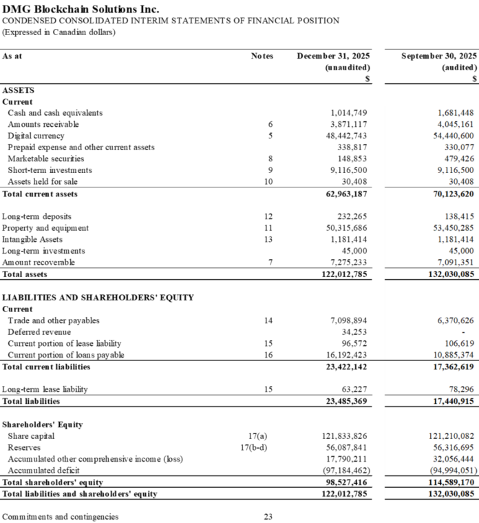 VANCOUVER, British Columbia, Feb. 25, 2026 (GLOBE NEWSWIRE) — DMG Blockchain Solutions Inc. (TSX-V: DMGI) (OTCQB US: DMGGF) (FRANKFURT: 6AX) (“DMG”), a vertically integrated blockchain and data center technology company, today announces its fiscal first quarter 2026 unaudited financial results. All financial references are in Canadian Dollars unless specified otherwise. Readers are encouraged to review the Company’s December 31, 2025 quarterly unaudited financial statements and management’s discussion and analysis thereof for an assessment of the Company’s performance and applicable risk factors, available at www.sedarplus.ca.