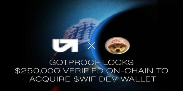 GOTPROOF, the infrastructure protocol for verifiable payments, spend proofs, and asset verification, today announced it has deposited $250,000 into a public Proof smart contract. The funds will remain locked until the original deployer of the WIF (dogwifhat) token submits their wallet, at which point the full amount will transfer automatically.
