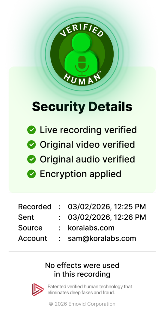 This verified channel confirms both the sender’s identity and human presence, while the message’s contents can be confirmed thanks to Emovid’s tamper-proof provenance tracking.