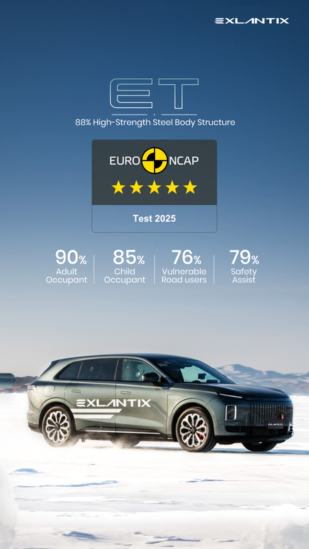 December 10, the EXLANTIX ET received the highest five-star safety rating in the latest Euro NCAP (2024 protocol) assessment.