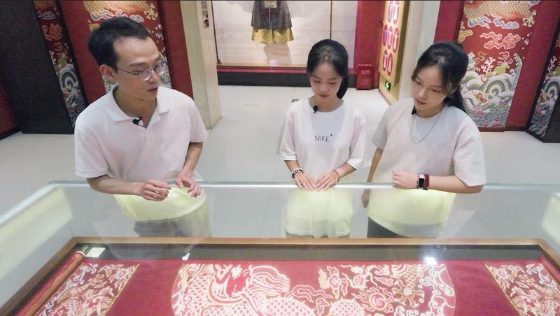 As they entered the museum’s exhibition hall, the two girls were immediately drawn to a restored piece of Zhuanghua (Patterned Weaving)-Gauze Dragon Robe with Full-Length Sleeves and Dragon Roundel, which belonged to Emperor Wanli of the Ming Dynasty. “These patterns are so exquisite; it’s as if they were painted directly onto the fabric. I can’t find a single seam!” Liang Yawen marveled. With a smile, He Guanyi explained that the 17-meter-long dragon robe demanded 1,840 warp threads and 120,000 weft threads. Using the Zhicheng (woven-to-shape) technique, the weavers wove the complete patterns for the robe’s front, back, collar, and lapel onto a single length of fabric. “In ancient times, having any seams in a dragon robe was strictly forbidden. The technique exemplified the ingenuity of our ancestors.”